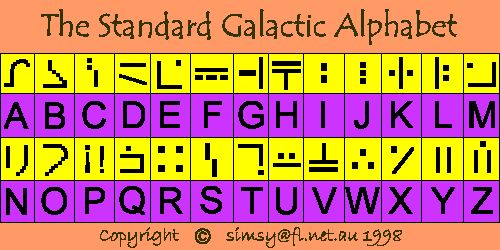 Komentajan Keen -pelien tavanomaisessa galaktisessa aakkosessa kirjoitettu komentosarja on vain salaus englanniksi kirjoitetuille sanoille, helposti käännettynä, kun tiedät vastaavat aakkoset.