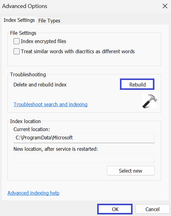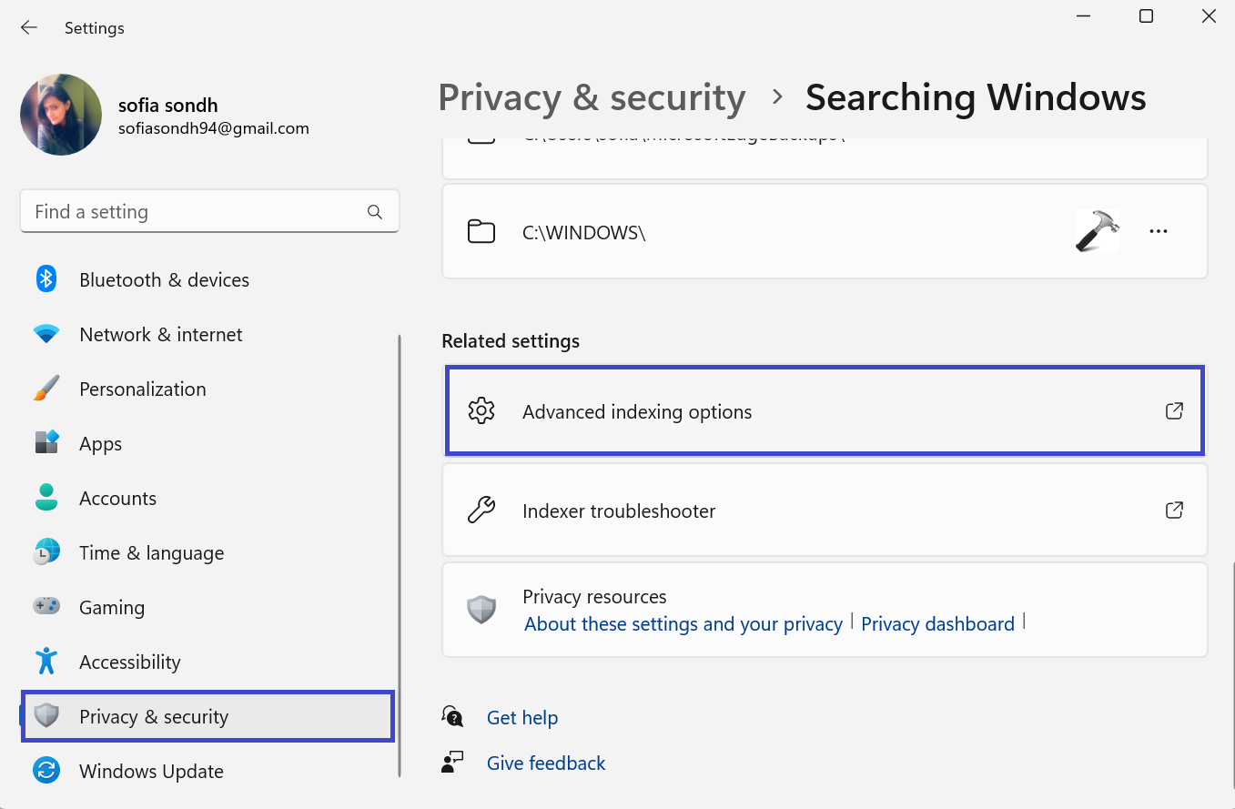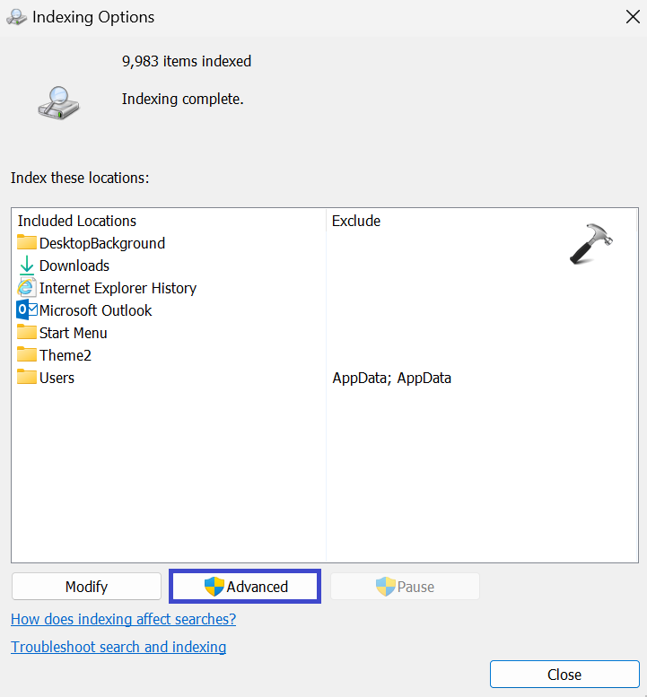 3. Napsauta ”Lisäindeksointivaihtoehtoja”. (Katso alla oleva kuva)