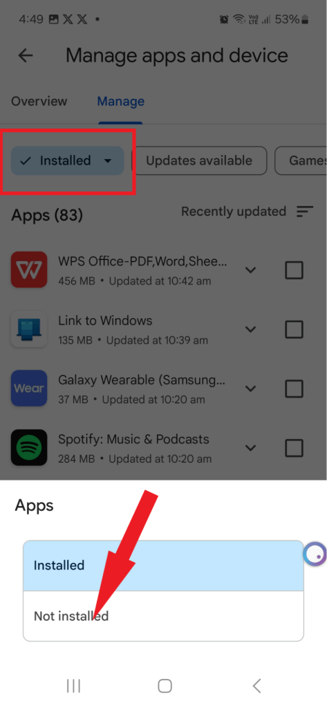 Vaihe 5:Napsautaasennettu painikeja sitten valitseEi asennettu. Tämä antaa sinulle luettelon peleistä ja sovelluksista, jotka olet poistanut tai poistanut laitteestasi milloin tahansa.