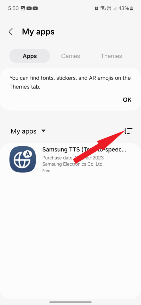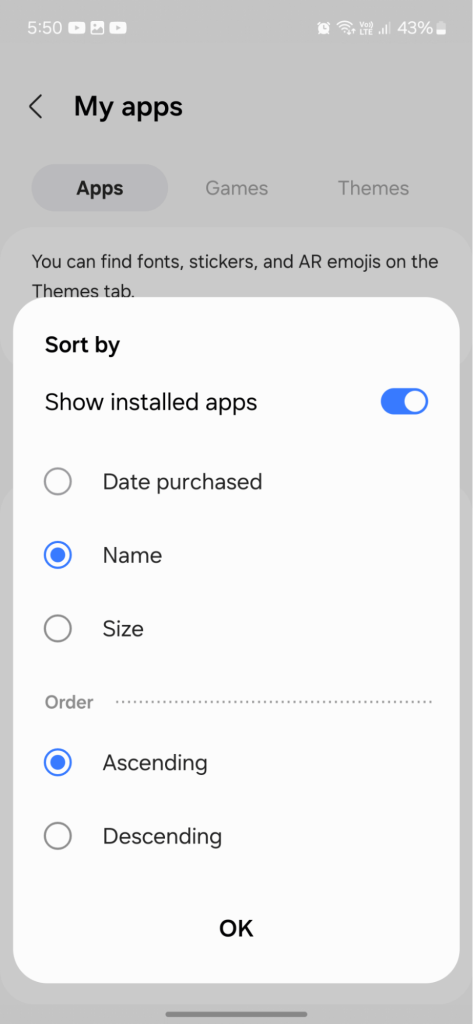 Vaihe 5:Ottaa käyttöönNäytä asennetut sovellukset'Vaihtoehto lyömällä kytkinkytkintä. Valitse mikä tahansa vaihtoehto:Ostettu päivämäärä, nimi tai koko. NapsauttaaHyvä.