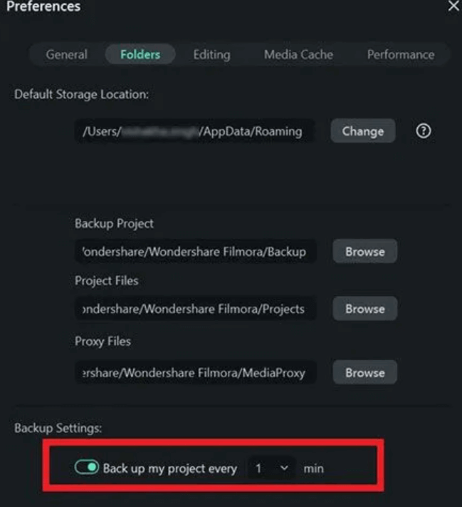 Kirjoittajan vinkki:Jotta tämä menetelmä olisi tehokas, sinun on otettava käyttöön "Varmuuskopioi projektini" -vaihtoehto Asetuksissa. Voit vahvistaa tämän asetuksen seuraavasti: Siirry kohtaan Tiedostot > Asetukset > Kansio > Varmuuskopiointiasetukset. Ota tapana tarkistaa "Varmuuskopio"-kansio säännöllisesti, varsinkin jos unohdat tallentaa usein.