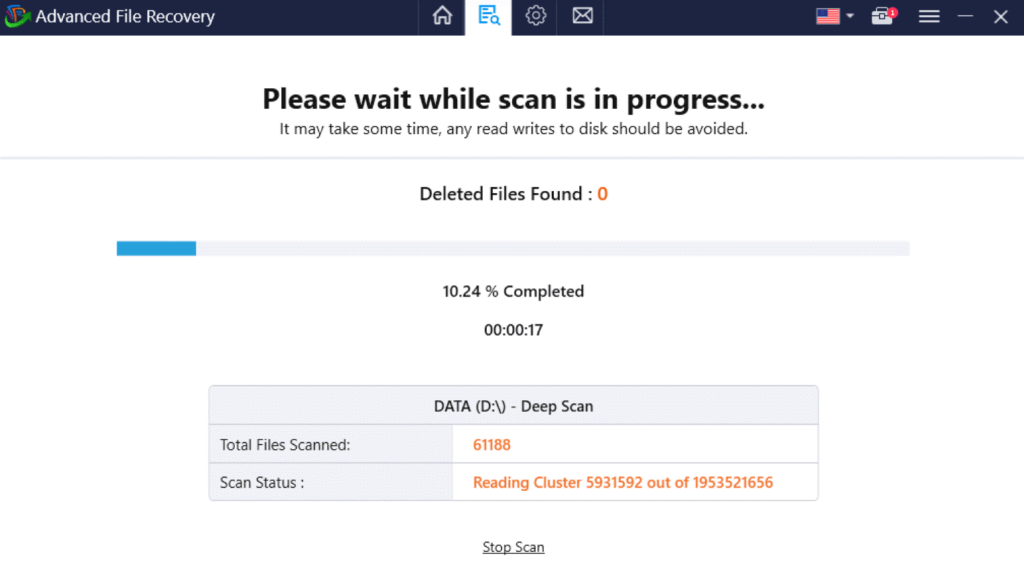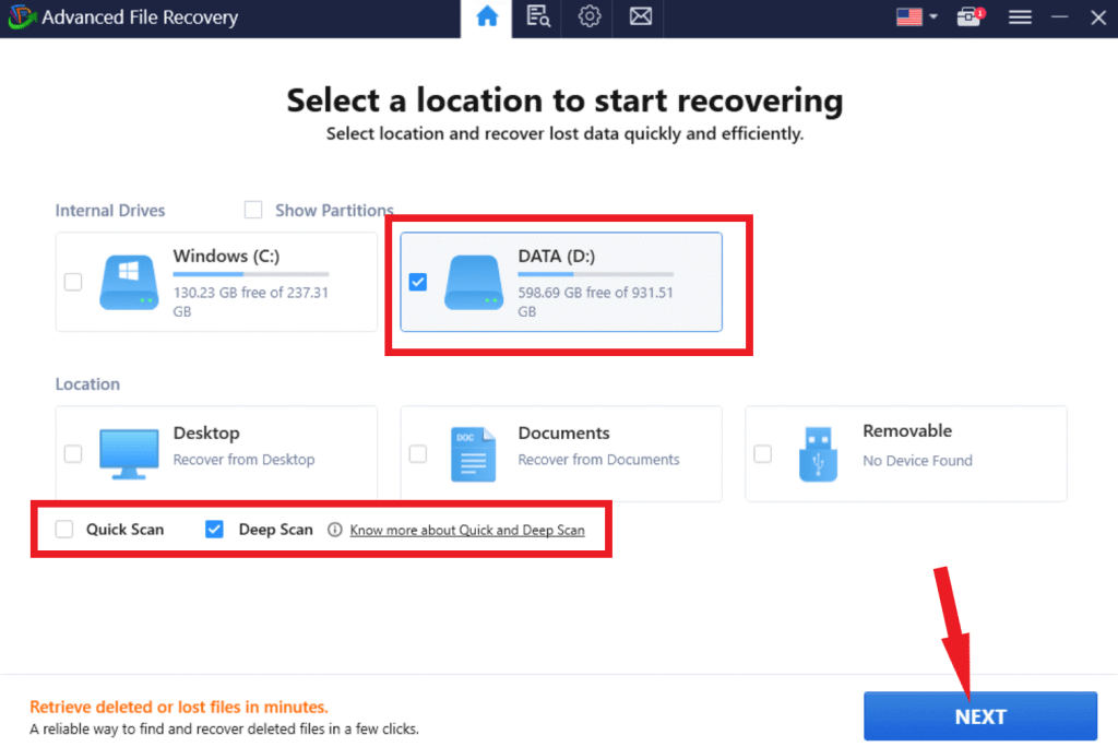 Suosittelemme valitsemaan Deep Scan, jotta voit etsiä kadonneita tiedostoja perusteellisesti.