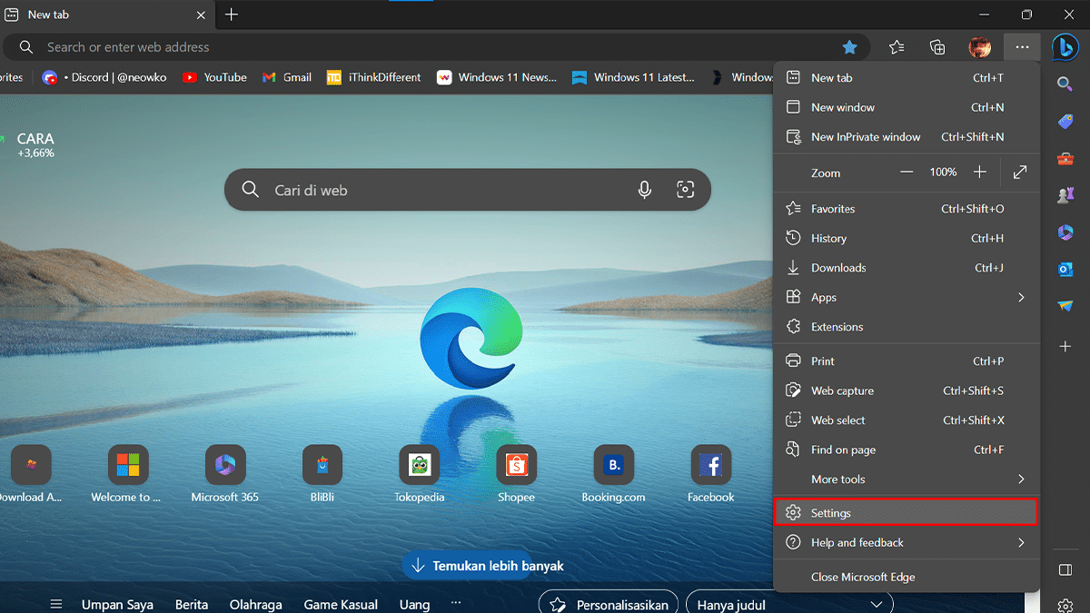 - AvataMicrosoft Edge> Napsauta päätä (kolmen pisteenä oleva) painike> ValitseAsetuksetvaihtoehto.