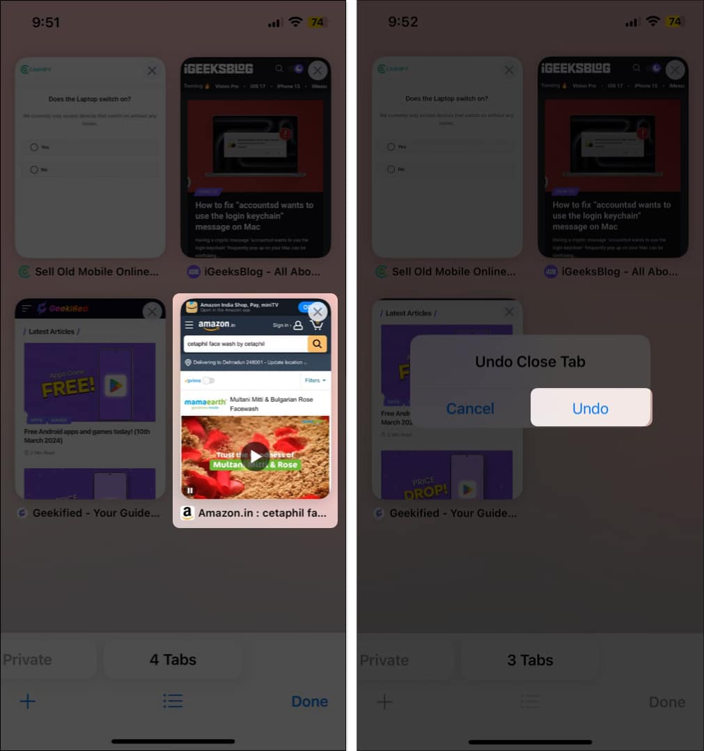 Tämä ominaisuus on oletuksena käytössä. Joten kun suljet vahingossa aktiivisen safari -välilehden, yksinkertaisestiRavista iPhone→ valitseKumoa Close -välilehtiponnahdusikkunasta verkkosivun uudelleen avaamiseksi.