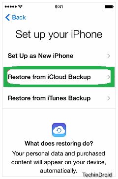 - Valitse iPhone -asetusnäytöstä “Palauta iCloud -varmuuskopiosta”Vaihtoehto.