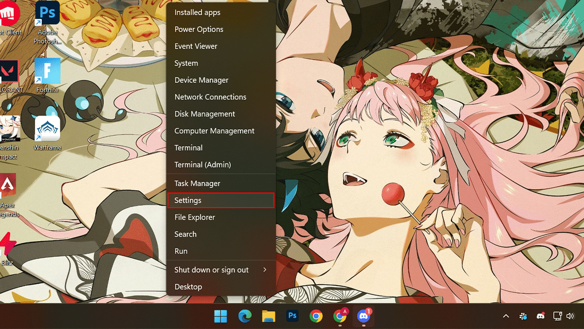 - Napsauta hiiren kakkospainikkeella Start> Napsauta asetuksia.