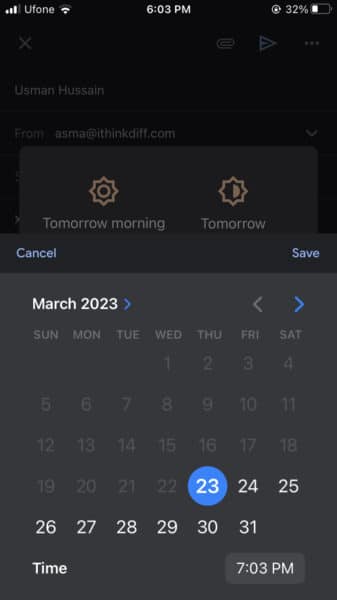 - Valinnan jälkeenAikatauluNäet luettelon ehdotetuista ajoista sähköpostisi lähettämiseen. Jos olet tyytyväinen johonkin näistä ajoista, napauta sitä vain valitaksesi sen. Jos haluat kuitenkin valita toisen ajan, napauta kuitenkinValitse päivämäärä ja aikaAsettaa oma aika ja päivämäärä sähköpostien lähettämiseen.