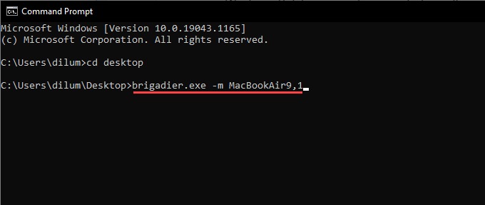 4.Kirjoittaabrigadier.exe -m MacBookAir9,1komento ja paina sittenKirjoittaaavain sen suorittamiseen.