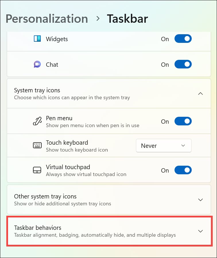 2.Vieritä tehtäväpalkin asetusikkunassa alaspäinTehtäväpalkin käyttäytyminenosa. Napsauta sitä laajentaaksesi avattavasta valikosta tämän osan alla.