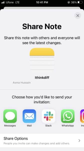 - Napauta Jaa -valikossa mitä sovellusta haluat jakaa muistiinpanon kuten viestit, postitse jne. Voit myös napauttaaOsakeoptiotLöydä lisäasetuksia, kuten jos käyttäjät jaat muistiinpanon, on lupa lisätä lisää ihmisiä. Löydät täältä myös lupa -asetukset, joiden avulla voit päättää, voivatko käyttäjät, joiden kanssa jakaa muistiinpanon, vain nähdä sen vai tehdä muutoksia siihen.