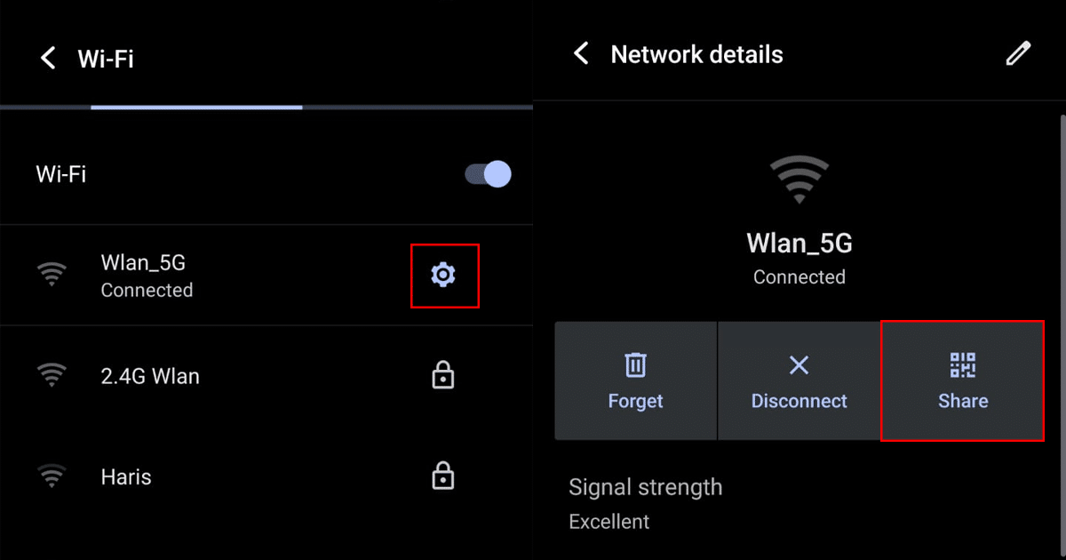 - Napauta Gear-kuvaketta (tai tietokuvaketta) tallennetun verkon vieressä, jonka haluat jakaa> Napauta jaa (tai QR-koodi tai Wi-Fi QR -koodi, laitteesta riippuen).