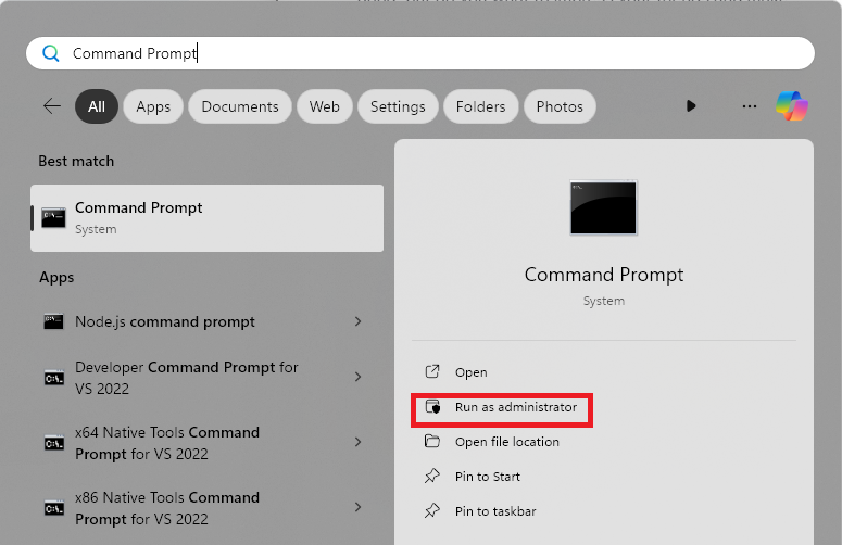 1.KäynnistääKomentokehotussovellus, jolla on hallinnolliset käyttöoikeudet. Voit tehdä sen etsimällä komentokehotteJärjestelmänvalvojanavaihtoehto.