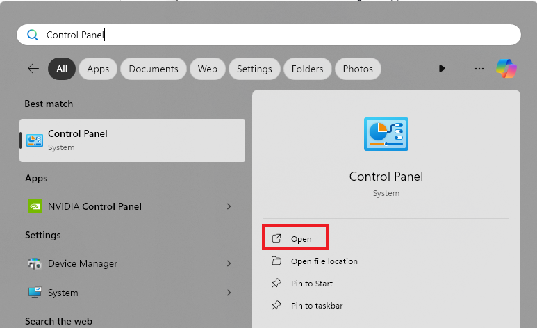 1.Avaa ohjauspaneelin sovellus. Voit tehdä sen etsimällä sovellusta aloitusvalikosta.