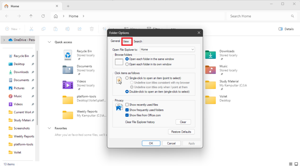 Toinen tapa tarkastella piilotettuja tiedostoja File Explorer -sovelluksessa on kansioasetuksista. Noudata näitä vaiheita, jotta voit kytkeä piilotettujen tiedostojen näkyvyyden päälle Windows 11: n kansioasetusten avulla: