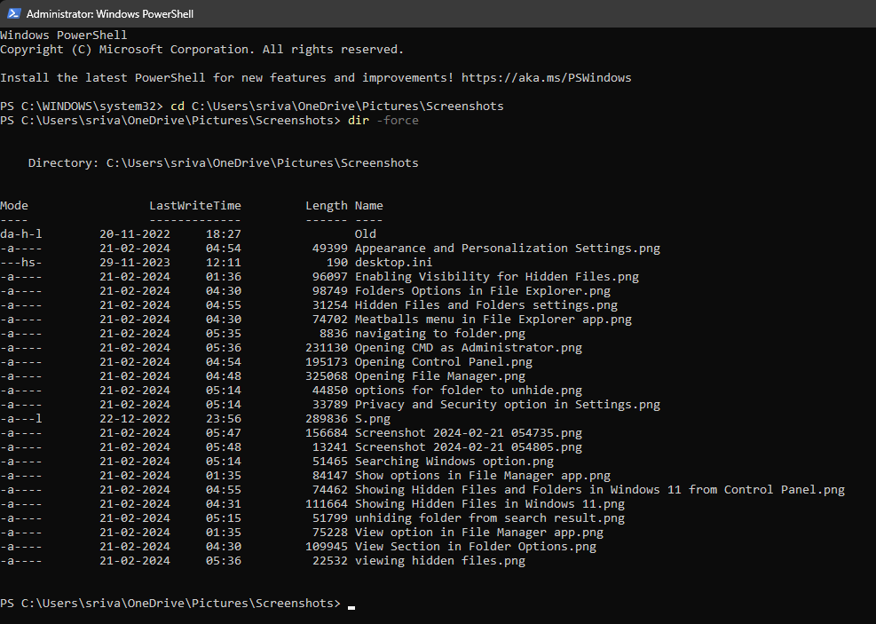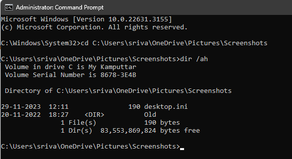 3.Suorita annettu komento nähdäksesi kaikki piilotetut tiedostot ja kansiot navigoidussa paikassa.