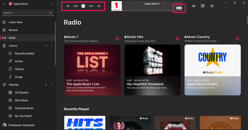 Nyt yksi toinen tärkeä asia, joka on pidettävä mielessä, on seShuffle- ja Repeat-painikkeet, sekä Ohita eteenpäin- ja Ohita taaksepäin -painikkeitaei toimi, kun toistat suoraa radioasemaa Apple Music -sovelluksessa Windows 11:ssä.
