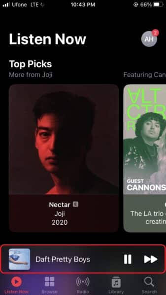 - Apple Music -näytön alareunassa näet kappaleen, jota tällä hetkellä soitetaan. Napauta tätä kappaletta tuodaksesi nyt soittavan näytön.