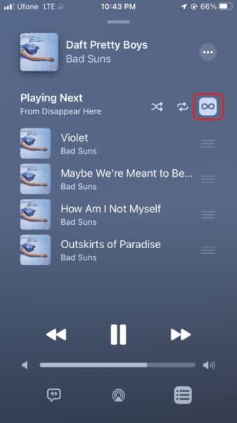 - Etsi nyt oikeassa yläkulmassa oleva AutoPlay -painiketta soittavana näytöllä. Sitä edustaa ääretön symboli (♾️). Napauta tätä painiketta sammuttaaksesi AutoPlay.