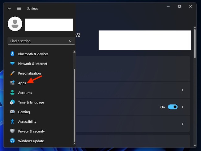 - Kun olet Asetukset -valikossa, valitse"Sovellukset"vasemmassa sivupalkissa.
