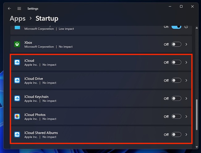 Hieman haudattu Windows -asetusten sisälle on vaihtoehto hallita sovelluksia, jotka voivat käynnistää käynnistyksen yhteydessä. Tätä menetelmää käyttämällä voit lopettaa ICloudin automaattisen käynnistyksen. Vaihtoehtoisesti tehtävienhallinta tekee myös hyvää työtä sallimalla/kieltämällä sovellukset/-palvelut avata Windows 11 -käynnissä.