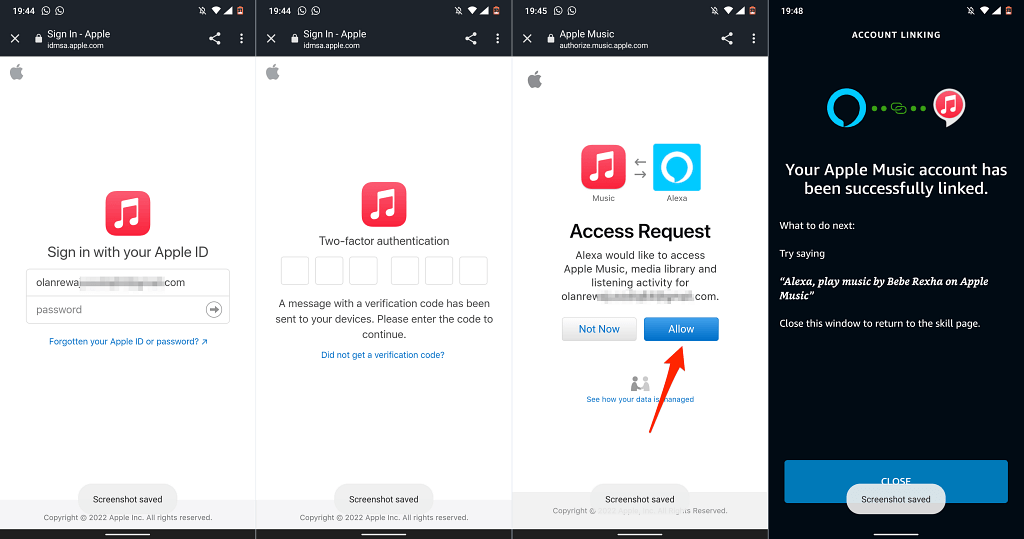 - Lopuksi napautaSallimyöntääksesi Amazon Alexalle pääsyn Apple Music -tilaukseesi.