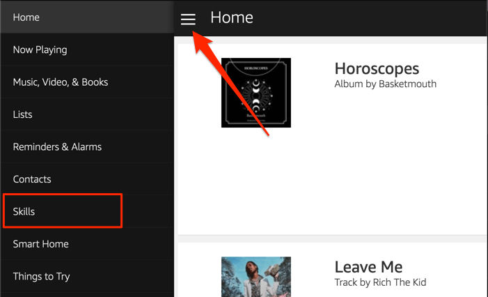 - Avaa Amazon Alexa -sovellus, napautaLisääoikeassa alakulmassa ja valitseTaidot ja pelit.