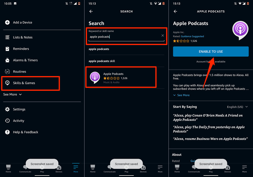 Apple Musicin tavoin voit linkittää Apple Podcastit Amazon-tiliisi Amazon Skills -verkkosivusi tai Amazon Alexa -sovelluksen kautta.