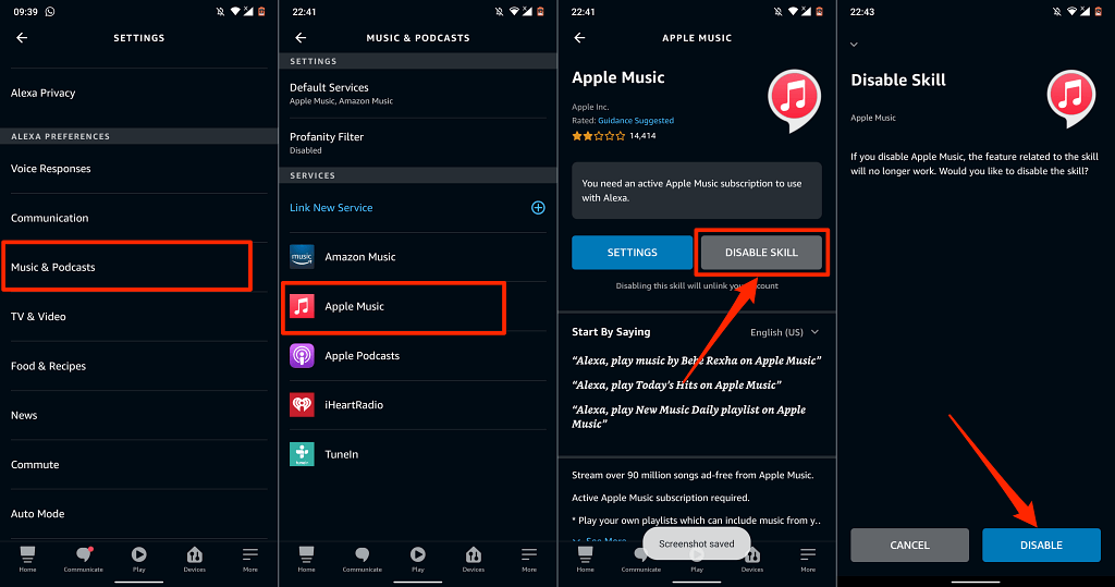 Avaa Alexa App -asetusvalikko ja valitseMusiikki ja podcastit, valitseApple Music, napautaPoista taito käytöstäja valitsePoista käytöstä.