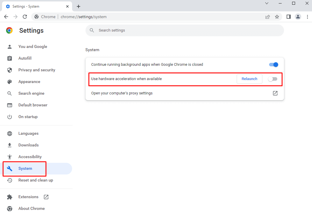 - ValitseJärjestelmävasemman sivupalkin valikossa ja poista käytöstäKäytä laitteistokiihdytystä, jos mahdollistavaihtoehto.