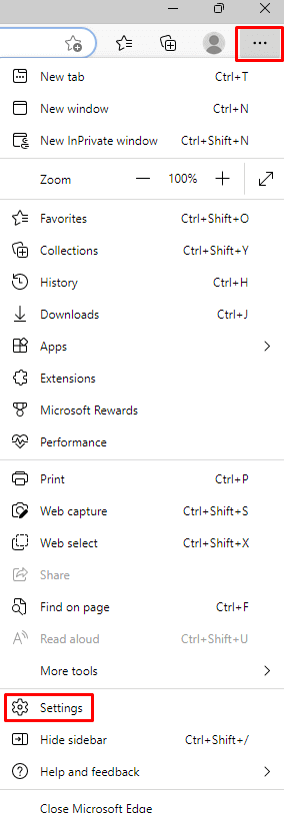 - Avaa Microsoft Edge ja napsauta kolmen pisteen kuvaketta. ValitseAsetuksetavattavasta valikosta.