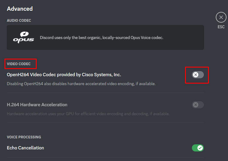 - Vieritä alas kohtaanEdistynytasetusosiossa ja poista se käytöstäVideo Codec. Tämä poistaa automaattisesti käytöstä laitteistokiihdytyksen videokoodauksen, jos se on käytettävissä.
