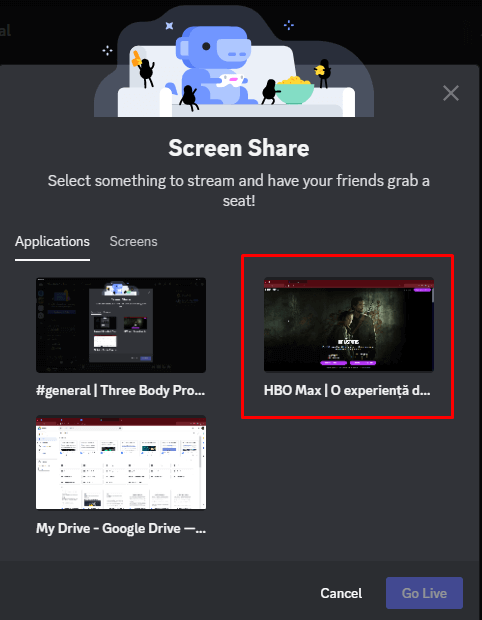Vaikka Discordin Go Live -ominaisuus on suunniteltu suoratoistoon, voit käyttää sitä lähettämään ystävillesi mitä tahansa HBO MAX -kanavalla katsomaasi. Voit myös suoratoistaa Hulua, Netflixiä ja paljon muuta Discordin avulla.