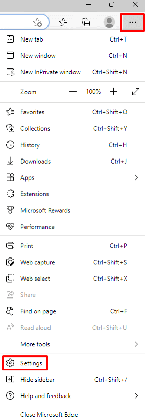 - Avaa Microsoft Edge ja valitseLisää(Kolme piste-kuvaketta) ikkunan oikeassa yläkulmassa. Mennä jhkAsetukset.