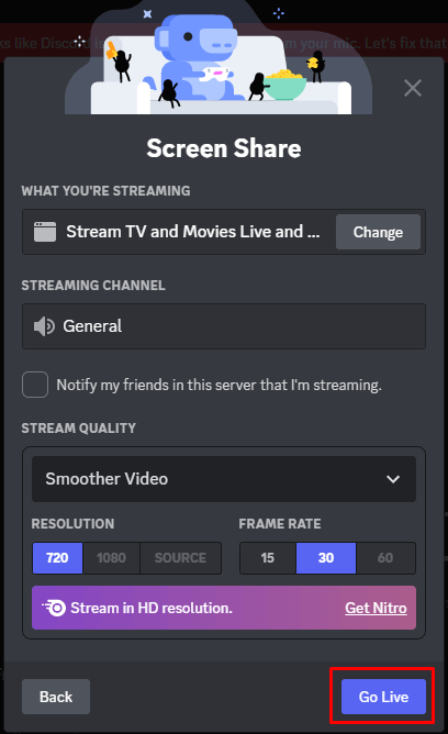- Säädä suoratoiston resoluutio ja kehysnopeus. Jos sinulla on ilmainen Discord -versio, sinulla on vaihtoehto 720p -resoluutio vain 30 fps: n nopeudella. Mutta Nitron kanssa voit valita paremman resoluution ja korkeamman kehyksenopeuden. Lopuksi, valitseMennä elämäänja aloita Hulun suoratoisto Discordissa.
