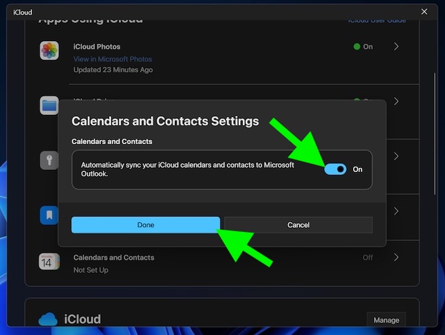 - Varmista nyt, että"Synkronoi automaattisesti iCloud -kalenterit ja yhteystiedot Microsoft Outlookiin"Vaihto on aktiivinen ja osu sittenTehtyPainike vahvistusta varten.