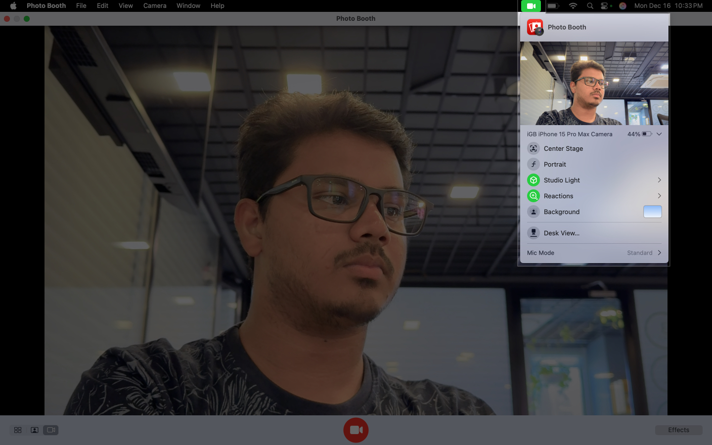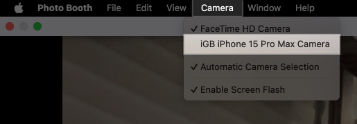 Napsauta nyt, kun olet Photo Booth -sovelluksessaKameravalikkorivillä ja valitse iPhonesi laiteluettelosta käyttääksesi sitä.