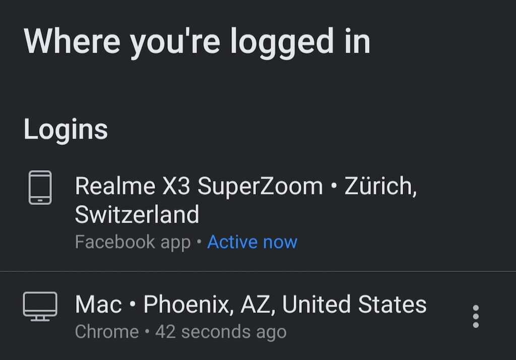 Siellä näet kaikki aktiiviset Facebook -istunnot, ts. Luettelo laitteista, jotka ovat kirjautuneet tilillesi juuri nyt. Jos näet luettelossa tunnistamattomia kirjautumisia, on mahdollista, että sinut on hakkeroitu. Valitse arkaluontoisten tietojen välttäminen aktiivisen istunnon vieressä luettelosta, jota et tunnista, valitseKirjautua sisään. Tämä lopettaa aktiivisen istunnon ja säästää siten kyseisen laitteen hakkerointiyritykseltä.