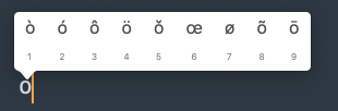 Esimerkiksi, jos haluat kirjoittaa kirjaimen o aksentilla, aseta kohdistin haluamallasi tavalla ja pidä sittenNAvain Macin näppäimistöllä. Kun aksenttivalikko tulee näkyviin, joko napsauta korostettua kirjainta tai kirjoittaa se vastaavaa numeroa.