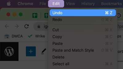 Tiedämme, että pikanäppäimet eivät ole kaikille! Siksi MacOS antaa sinun kumota muutokset valikosvaihtoehdon kautta. Voit käyttää kumousta vaihtoehtoa poistumatta sovelluksesta.