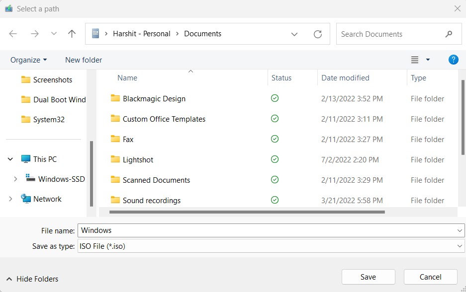 7. Valitse sijaintiminne haluat tallentaa Windows 11 -median asennustiedoston.