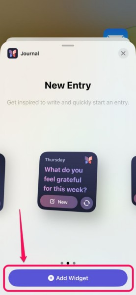 Kun se on lisätty iPhonen aloitusnäyttöön, se näyttää automaattiset kehotukset rohkaisemaan sinua tekemään uusia päiväkirjamerkintöjä. Nämä kehotteet muuttuvat päivittäin, ja voit käyttää uuden merkintäpainiketta widgetissä avataksesi sisäänkäynninsivun Journal App -sovellukseen. Jos et pidä kehotuksesta, voit jopa käyttää seuraavaa kehotusta painiketta uuden luodaksesi uuden.