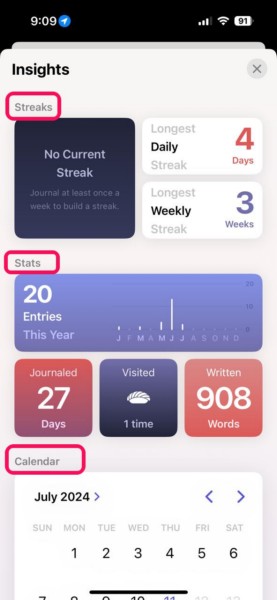 Haku- ja lajitteluominaisuuksien lisäksi Apple on myös lisännyt uuden oivalluksen sivun iPhonen Journal App -sovellukseen iOS 18: n kanssa. Tämä uusi osio toimii perusteellisen tiedon keskittimenä käyttäjien päiväkirjamerkinnöistä ja päiväkirjastapoista.