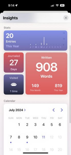 Uusi oivallussivu ei vain tarjoa selkeää kuvaa Journal -sovelluksen käytöstä, vaan myös antaa käyttäjille mahdollisuuden käydä hyödyllisiä tietoja, kuten kirjoitettujen sanojen kokonaismäärä, kokonaismäärä kuukausi tai vuosi ja vieraillut paikkoja.