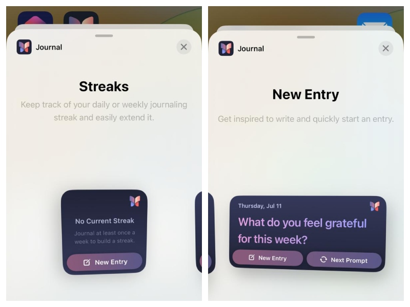 Erilaiskokoisten raitojen ja uusien pääsywidgetien lisäksi on olemassa widgettejä ehdotusten, äänitallennuksen, kameran, valokuvien, paikkojen ja mielentila. Nämä widgetit toimivat nopeana pääsypainikkeina uusille päiväkirjamerkinnoille, joissa on asiaankuuluvaa sisältöä iPhonen päiväkirjasovelluksessa iOS 18: ssa.