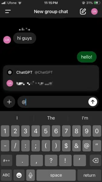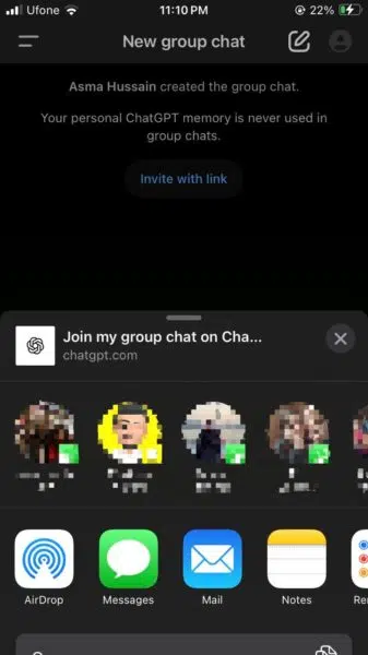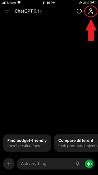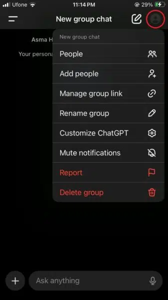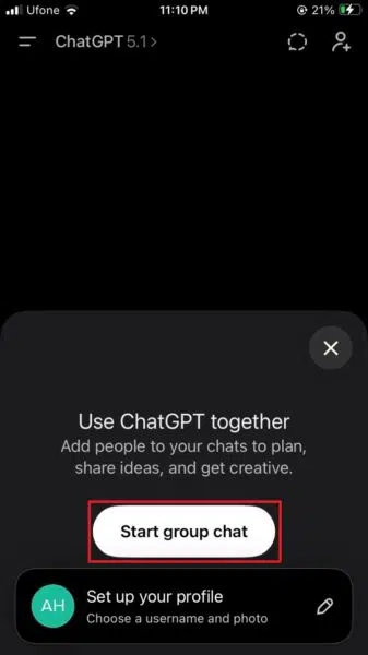 Voit myös muuttaa olemassa olevan chatin ryhmäksi. Napauta henkilökuvaketta uudelleen, aloita ryhmäkeskustelu ja ChatGPT luo kopion, johon voit kutsua muita. Alkuperäinen chat pysyy erillisenä.