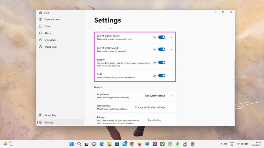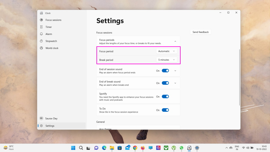 Voit myös muokata keskittymisistuntoa useilla tavoilla. Useat vaihtoehdot Focus settings -valikossa voivat tehdä kokemuksesta vieläkin paremman. Voit käyttää tarkennusasetuksia Kello-sovelluksesta, mutta voit tehdä sen myös Windowsin asetuksista.