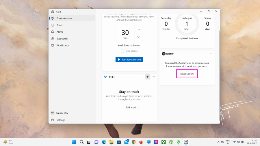 Voit myös parantaa Focus Session -kokemusta Spotify-integraation avulla kuunnellaksesi musiikkia tai podcasteja istunnon aikana. Mukana on myös Microsoft To Do -integraatio, jos haluat tarkistaa tehtävät yksitellen suoritettuaan. Tässä on mitä sinun on tehtävä Spotify-integraatioon.