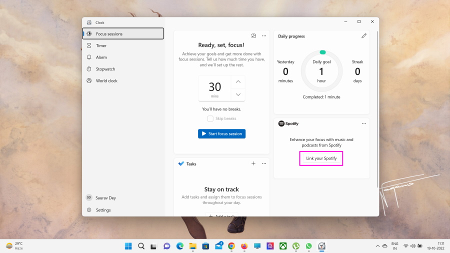 Viimeisimmän 22 tunnin päivityksen jälkeen Microsoft integroi Focuksen Kello-sovellukseen. Joten voit käyttää tarkennusta Kello-sovelluksesta. Mutta se ei ole ainoa tukiasema. Voit käyttää sitä myös Windows 11:n pika-asetusten ja asetussovelluksen kautta.