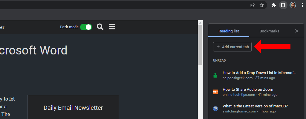 Voit nyt napsauttaaLukuluetteloPainike sivupaneelin yläosassa. Lisää verkkosivun lukuluetteloon napsauttamallaLisää nykyinen välilehti. Tämä sivu ilmestyyLuetonOsa Chrome -lukuluettelossa.