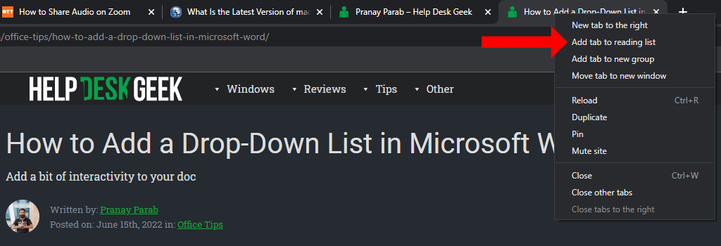 Vaihtoehtoisesti voit napsauttaa hiiren kakkospainikkeella mitä tahansa Avaa-välilehteä Chromessa ja valitaLisää -välilehti lukemisluetteloon. Tämä lisää sen tallennettujen sivujen luetteloon Chromen lukuluettelossa.